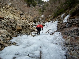 さて、上を見上げると、正直、本音で言うと、しょぼい状況。それでも案外面白い氷が現れるかも知れませんねと、ますます歩きづらくなったガレをヨタヨタと登っていく。