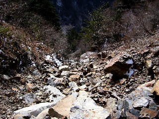 "舞姫ルンゼのガレはこんな風。かなり不安定。F3の下降は右岸側なら50m1本二つ折りでどんぴしゃ降り立つことができる。"