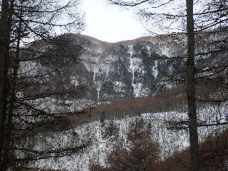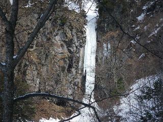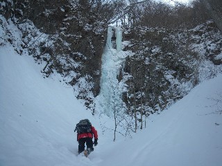 ロットの滝、これがつまりは不動前の滝なんだけど、先週のものだろうトレースがうっすら雪を被っている程度で、だからラッセルもなく辿り着くことができた。下から見上げるこの滝、想像していたよりでかく、また上部の氷柱は立派だ。明日予定している中央ルートのウォーミングアップのつもりできたが、そんなわけには行かなさそうだって事が一目でわかった。