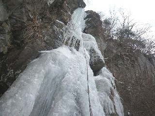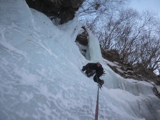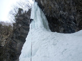 準備をして直ぐに登り始める。簡単そうに見えた下部も難しく、気泡を含んでいない部分は硬く、コブラを振る手が疲れる。最初は一気に登りきるつもりだったが、氷柱に近づいたあたりで残りのスクリューの本数も不安になり、結局ピッチを切ることとなった。