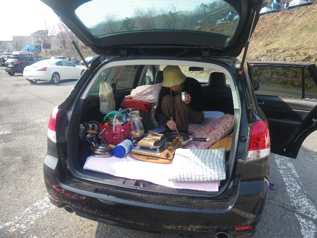 翌朝、五竜遠見スキー場テレキャビン乗り場の駐車場に車を移動し、まずはゆっくり朝食タイムだ。