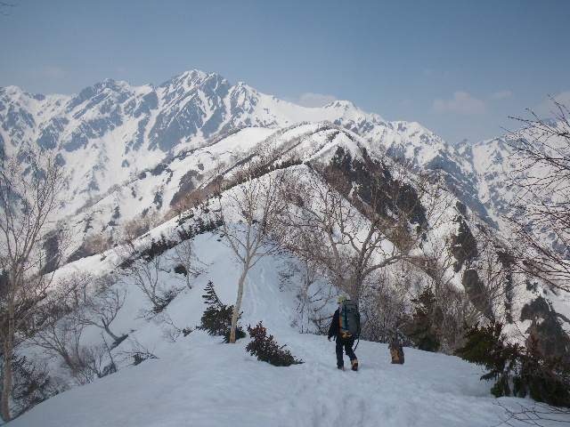 テン場から白岳沢への下降は程よい傾斜で、雪も締まって不安ない。G0稜上にはガイドパーティー以外に4人パーティーが先行しているのが見える。