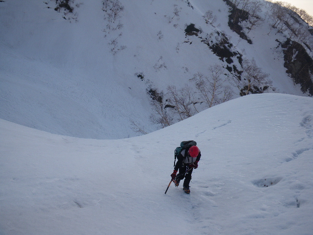 直ぐに白岳沢に降り立ち、対岸のG0稜にむかって雪面を上がる。あっけないほどのアプローチだった。