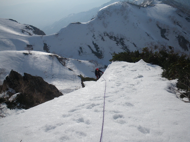 G0稜にあがって少し先、雪面が狭くなっているところでシュルンドによる段差が生じている部分があり、この部分とその上の傾斜の強い雪面の都合2ピッチ、ロープを出して確保し合ったが、その後はロープはザックにしまって登行していく。