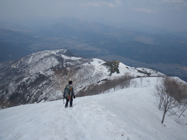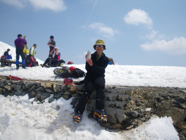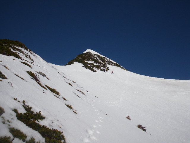 気温はかなり高く、先行のトレースを踏み抜くこともしばしばとなり、そのたび難儀するが、雪崩の心配はなさそうだし、しんどいながら残雪の山をエンジョイだ。