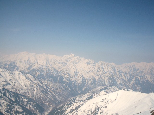 360°大パノラマの景色をしばし満喫。春特有の霞みの中、剣岳は遠い。